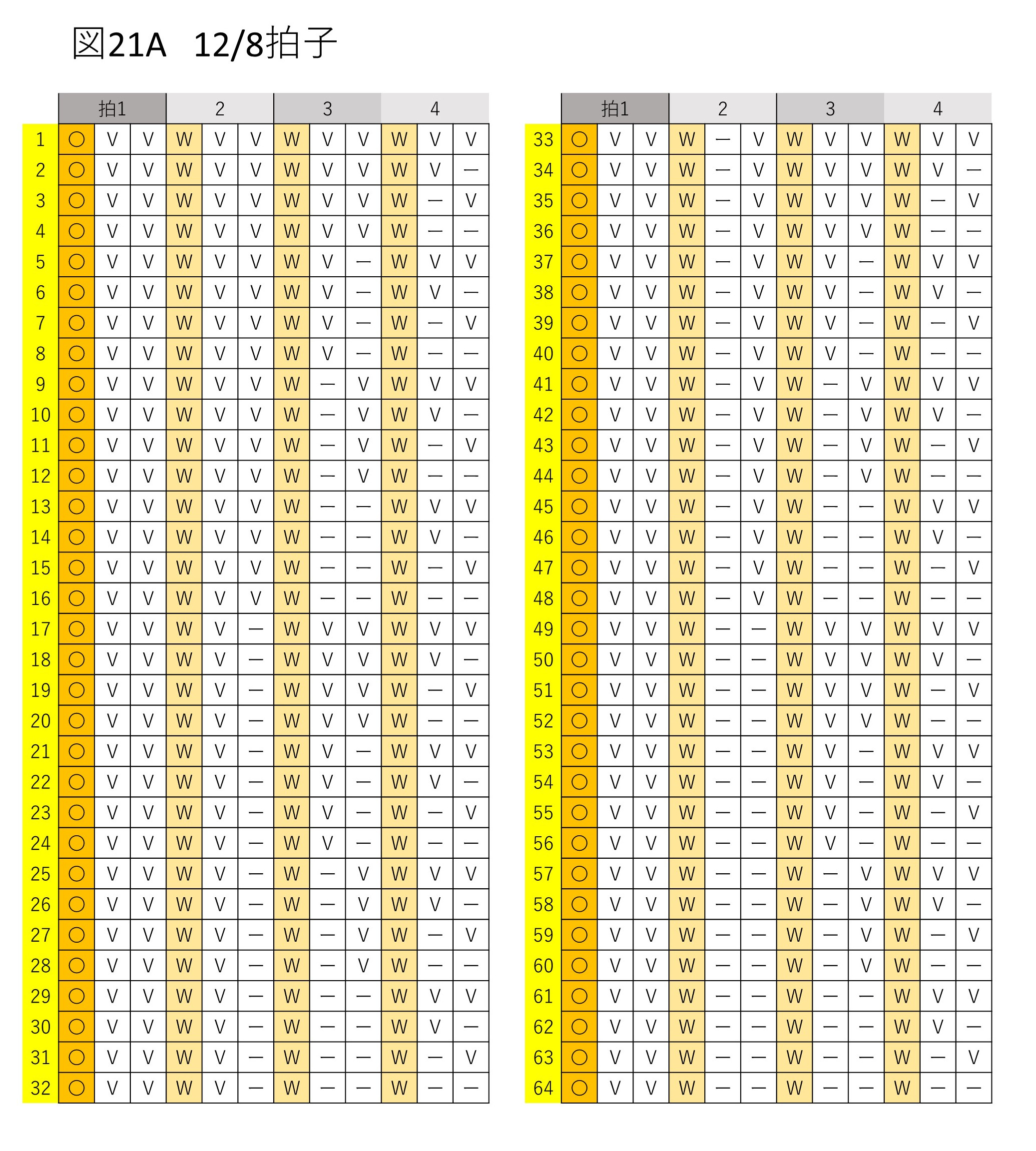 ・小節の最初の拍(強迫または前拍)の音を〇で、他の拍(弱拍または後拍)の音をVで表す。ーは前音の延長または休止拍を表す。音源では、〇を大太鼓で、Vを小太鼓で、ーを前音の継続または無音で表した。また、バックの拍にシンバルをいれた。