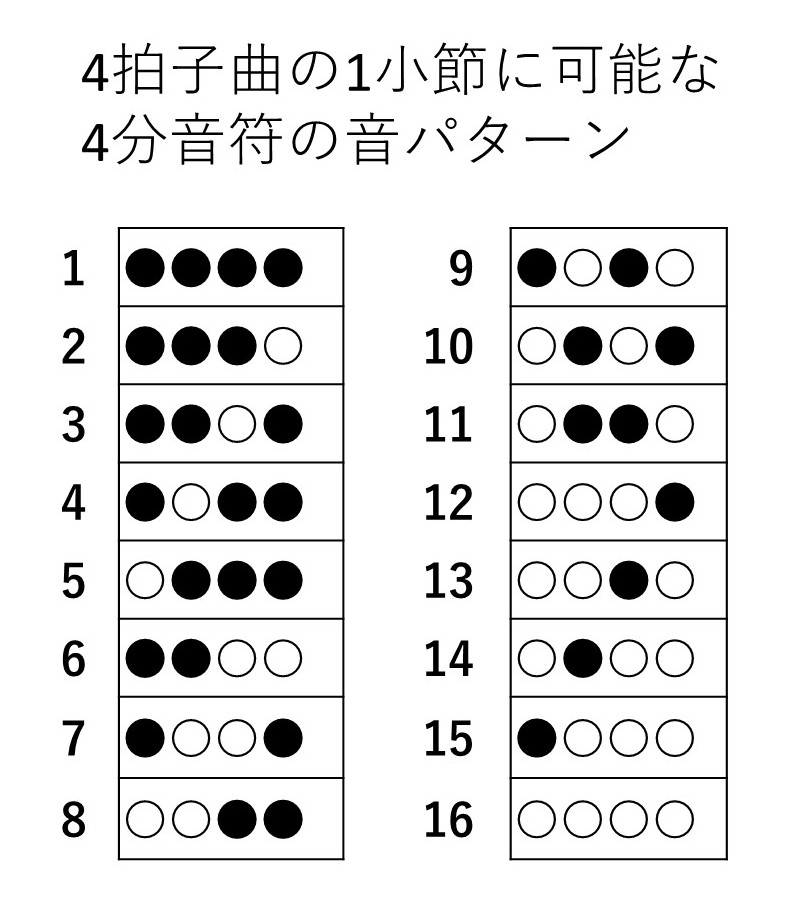 ・この場合も4拍子曲なので1小節の音パターンには16通りのリズムがある