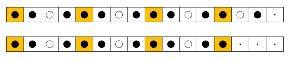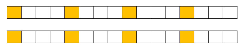 1つの拍(繰り返しリズムの単位)を🔲(マス目)で表しました(図1)。拍の速さは普通の速さで歩く速度70回/分(70bpm)くらいです。現実には曲によりその1/2から2倍の間の多様性があります。すなわちbpm=35~140回/分が拍の一般的速度です。曲の印象は速さにより異なります。どんな曲も2つの速さbpm=70およびbpm=140で演奏してみるとその印象が分かります。