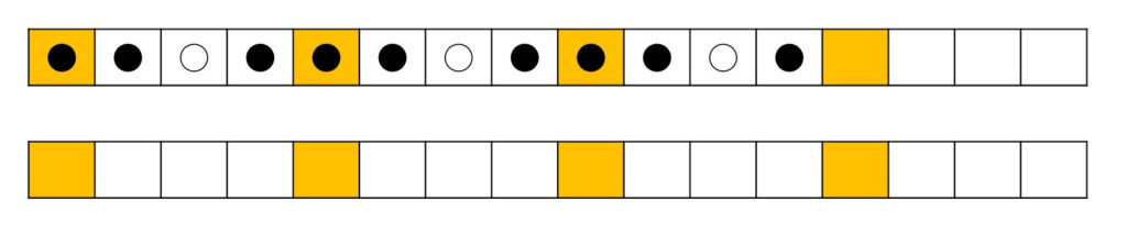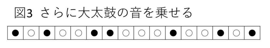 さらに大太鼓(●)の音をところどころに乗せました(図3)。しかし、異なる音がランダムに乗るだけではやはり曲らしくありません。