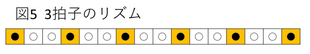 3拍子(図5) 3拍ごとに大太鼓の音がのる小節からなる曲。