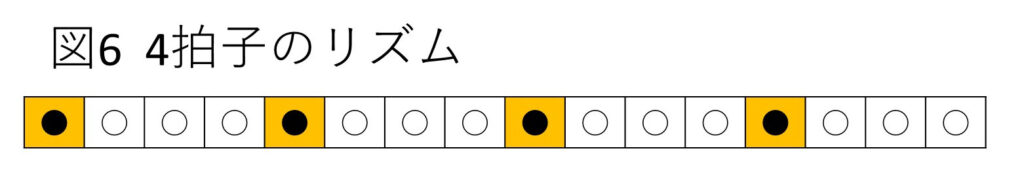 4拍子(図6) 4拍ごとに大太鼓の音がのる小節からなる曲。