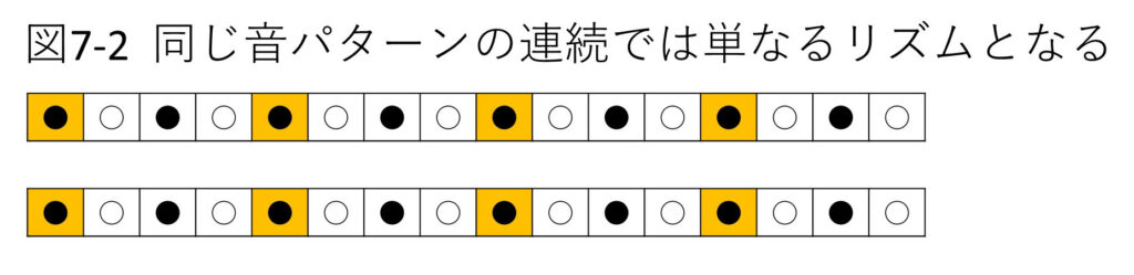 ・同じ音パターン(小節)の連続では単なるリズムとなる(図7-2)