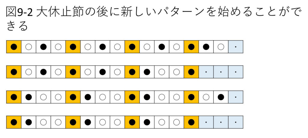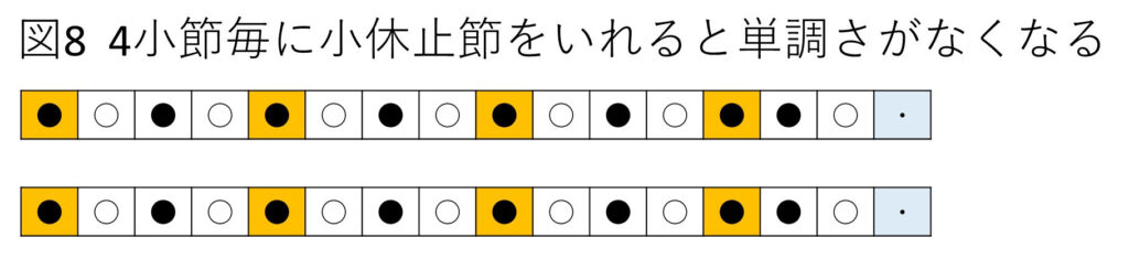曲は4小節目の小休止節により同じパターンの繰り返しによる単調さがおさえられ、再び音パターンの繰り返しが可能となります。しかし、繰り返しを4回目、5回目、6回目と繰り返すうちにしだいに単調さ(停滞感)がでてきます。そこで第8小節目にもう一つの休止節を入れます。こうして曲は4小節毎に休止節を入れることで拍子の繰り返しによる単調さを避けながら曲を進めることができます。