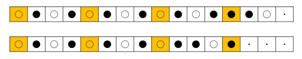 ⑦同じ音パターンの大楽節を2つつないで曲にします。ただし、2つ目の大楽節は大休止節直前の小節の音パターンをそれまでのものとはちがうものにします。