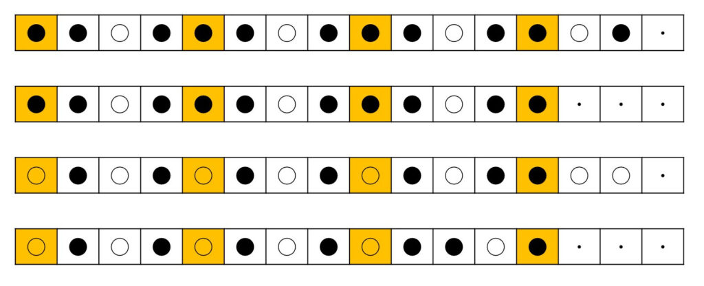 aとbの繰り返しによる小楽節。aabbをもつ。a小節を2個入れた後にaとはことなる音パターンのb小節を入れ、4小節目には bの音パターンの小休止節b’を入れる。5小節目からは同じことを繰り返し、8小節目には大休止節を入れる。b”は大休止節にあわせて音パターンを修正することもある。この方法で可能な小楽節の種類数は16×15=240個。