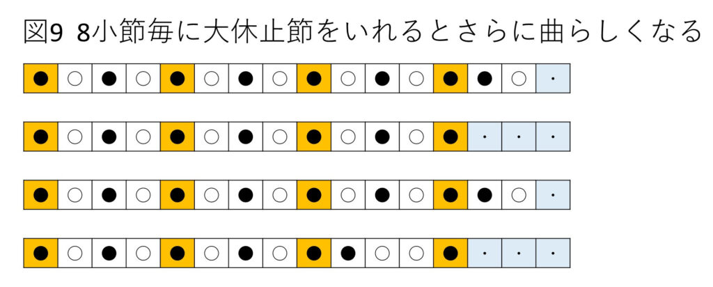 ・8小節(2小楽節)毎に大休止節をいれて区切るとさらに曲らしくなる(図9)